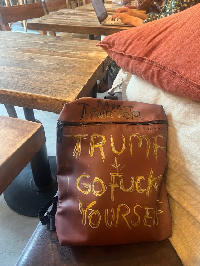 I have been wearing my backpack on extensive travels in Europe. Since for the most part Europe views Trump as the equivalent of the Black Death, I did not expect more than the occasional jeer or comment. That has turned out to be pretty much the situation. Oh, there was a young man in London doing his best “Tomorrow Belongs to Me” billy club act. Another London man snarling at me that Trump is not a rapist. An older woman spitting “disgusting” at me in Germany (she was American, however.)